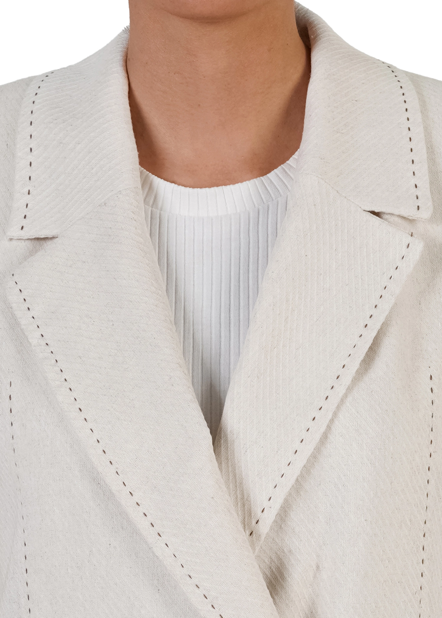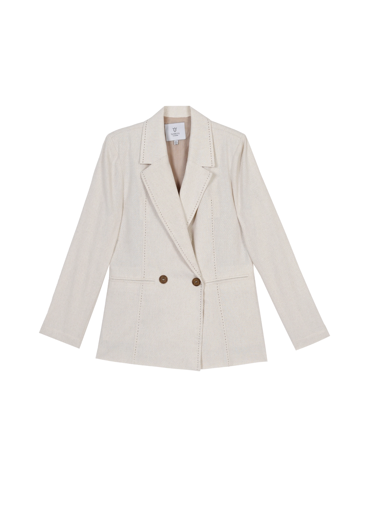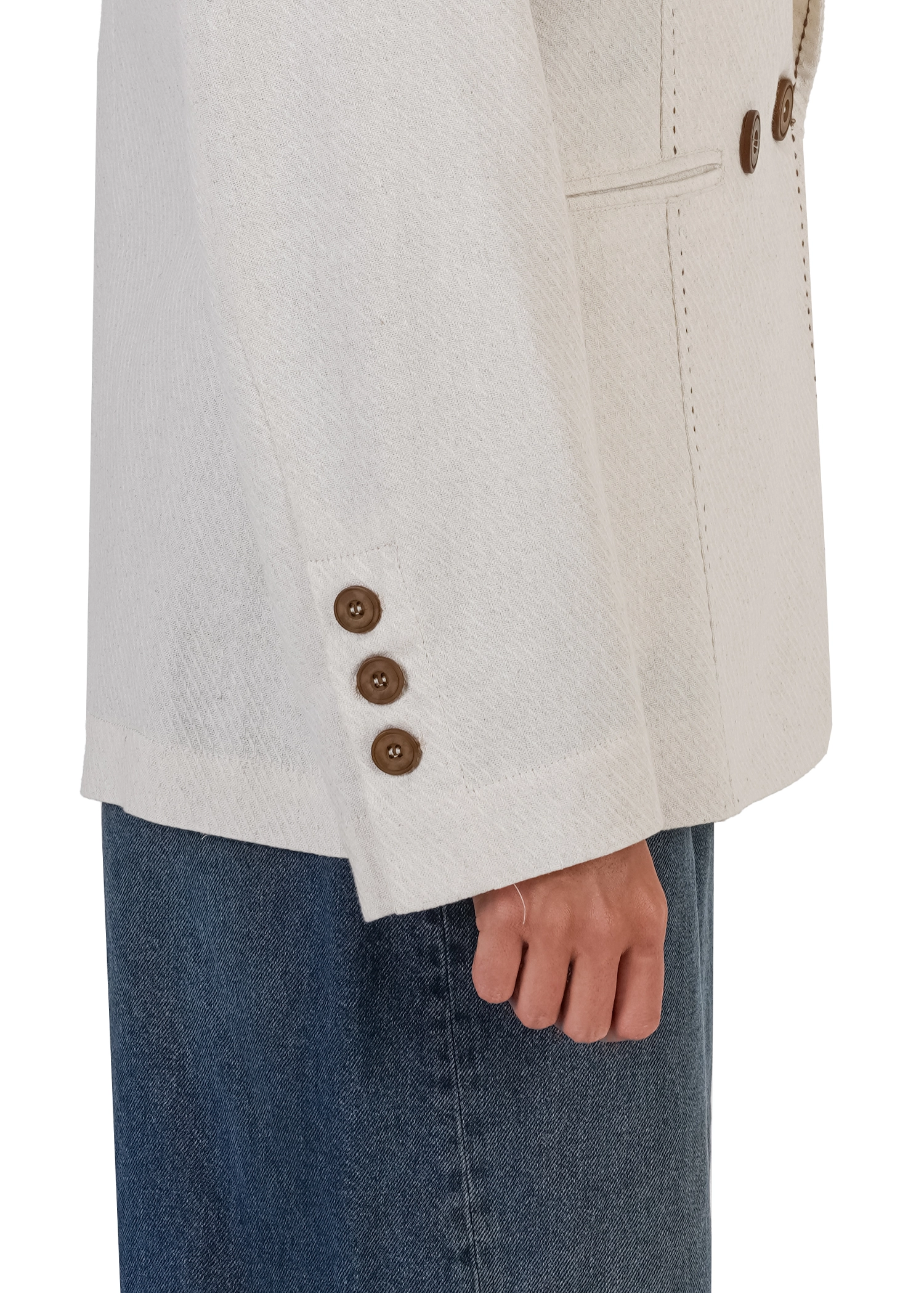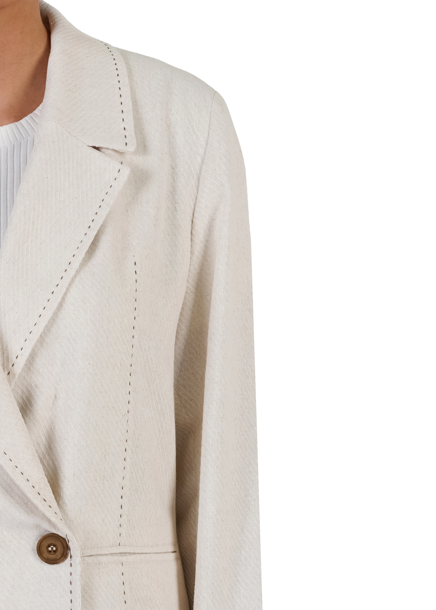 این کت زنانه با طراحی دو دکمه و دوخت‌های ظریف دمسه‌دوزی، جلوه‌ای خاص و متمایز دارد. پارچه لینن مورب با بافت طبیعی و ظاهری شیک، به لباس حالتی سبک و خوش‌فرم می‌دهد و آن را به انتخابی ایده‌آل برای موقعیت‌های رسمی و نیمه‌رسمی تبدیل می‌کند.