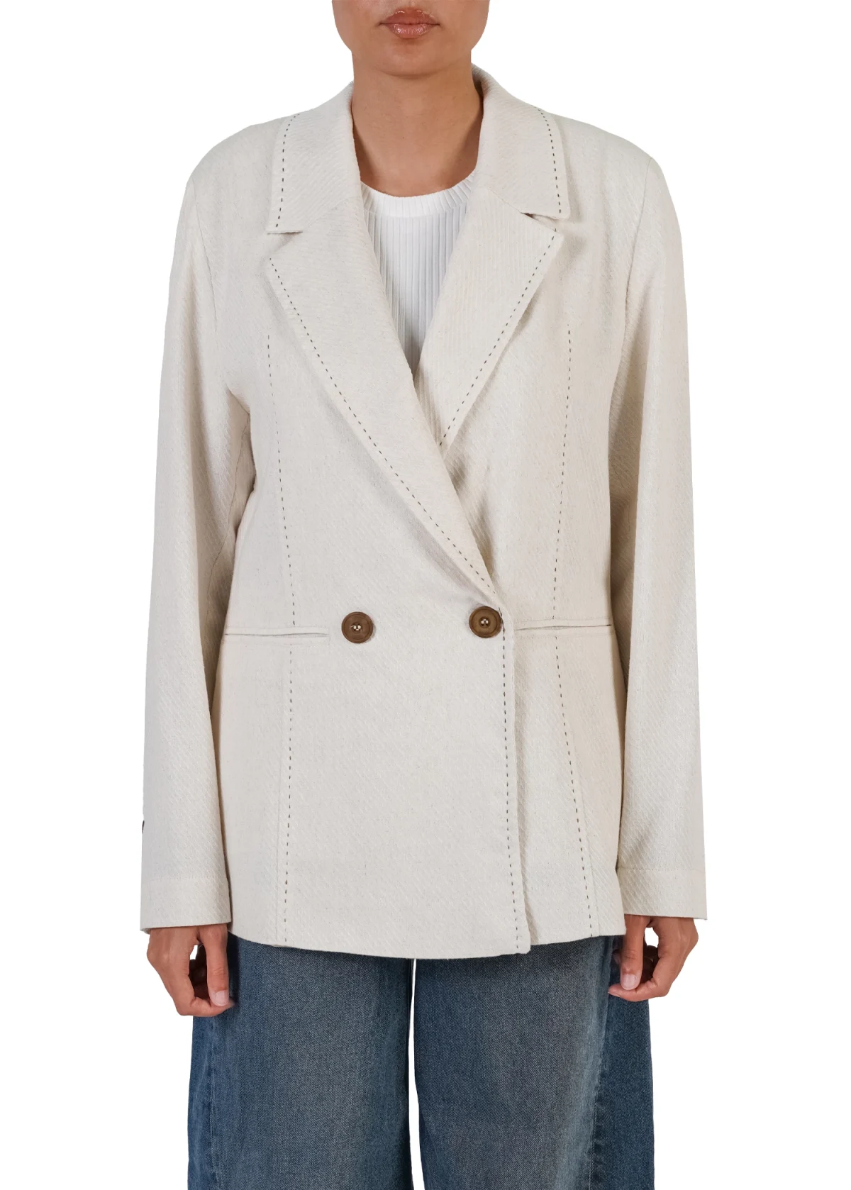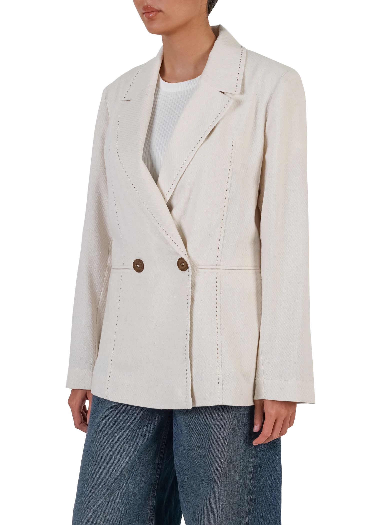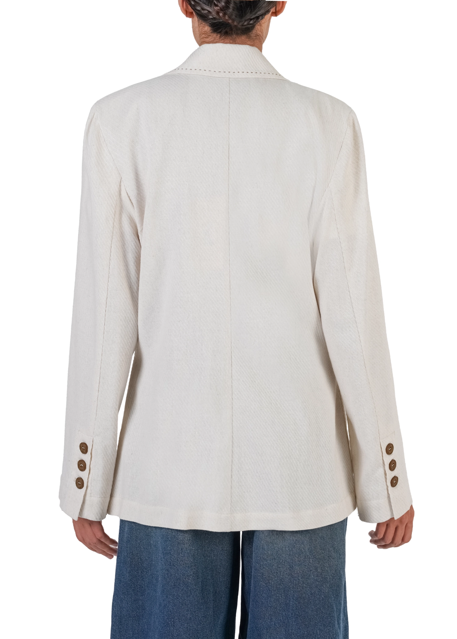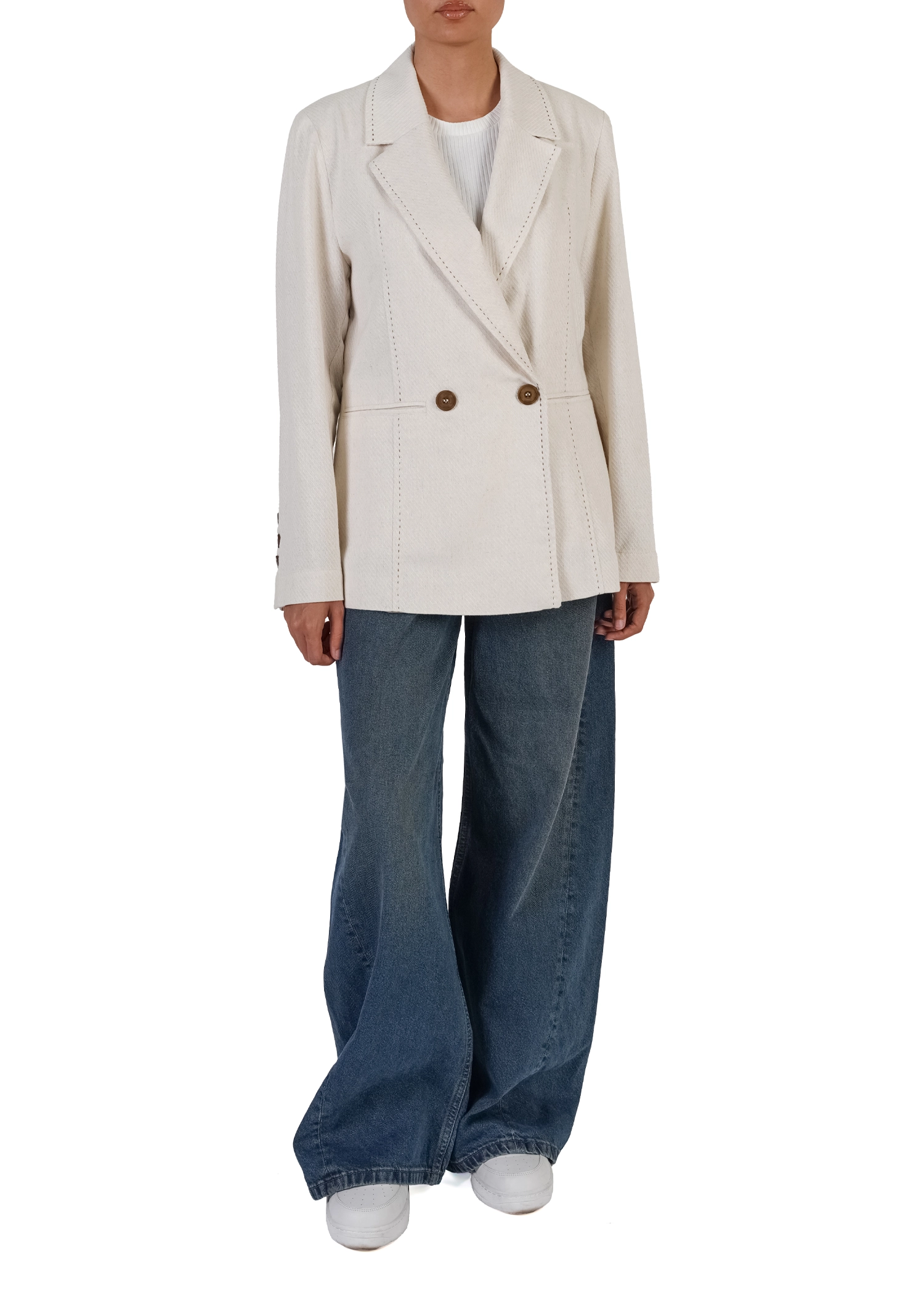 این کت زنانه با طراحی دو دکمه و دوخت‌های ظریف دمسه‌دوزی، جلوه‌ای خاص و متمایز دارد. پارچه لینن مورب با بافت طبیعی و ظاهری شیک، به لباس حالتی سبک و خوش‌فرم می‌دهد و آن را به انتخابی ایده‌آل برای موقعیت‌های رسمی و نیمه‌رسمی تبدیل می‌کند.
