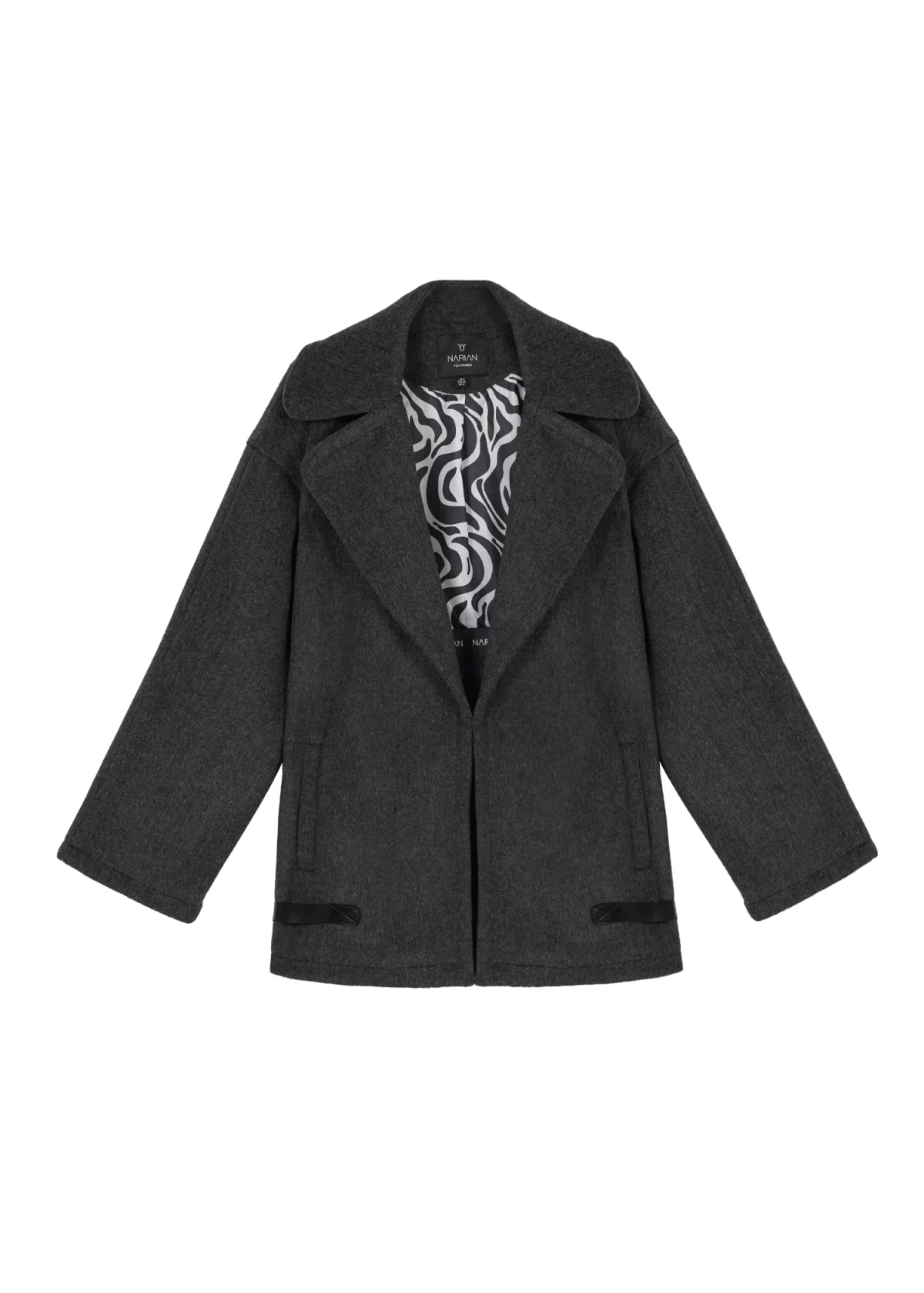 حلقهی آستینها نیز با دوخت رودوزی همرنگ و ظریف، در فاصلهی ۲ سانتیمتری از لبه تزئین شدهاند که هماهنگی بینقصی با سایر قسمتهای لباس دارد. داخل پالتو، آستر پونژه کار شده که در بخش بالایی دارای طرح چاپی و در بخش پایینی ساده است؛ ترکیبی که حس ظرافت و تمایز را در ساختار لباس تقویت میکند.
