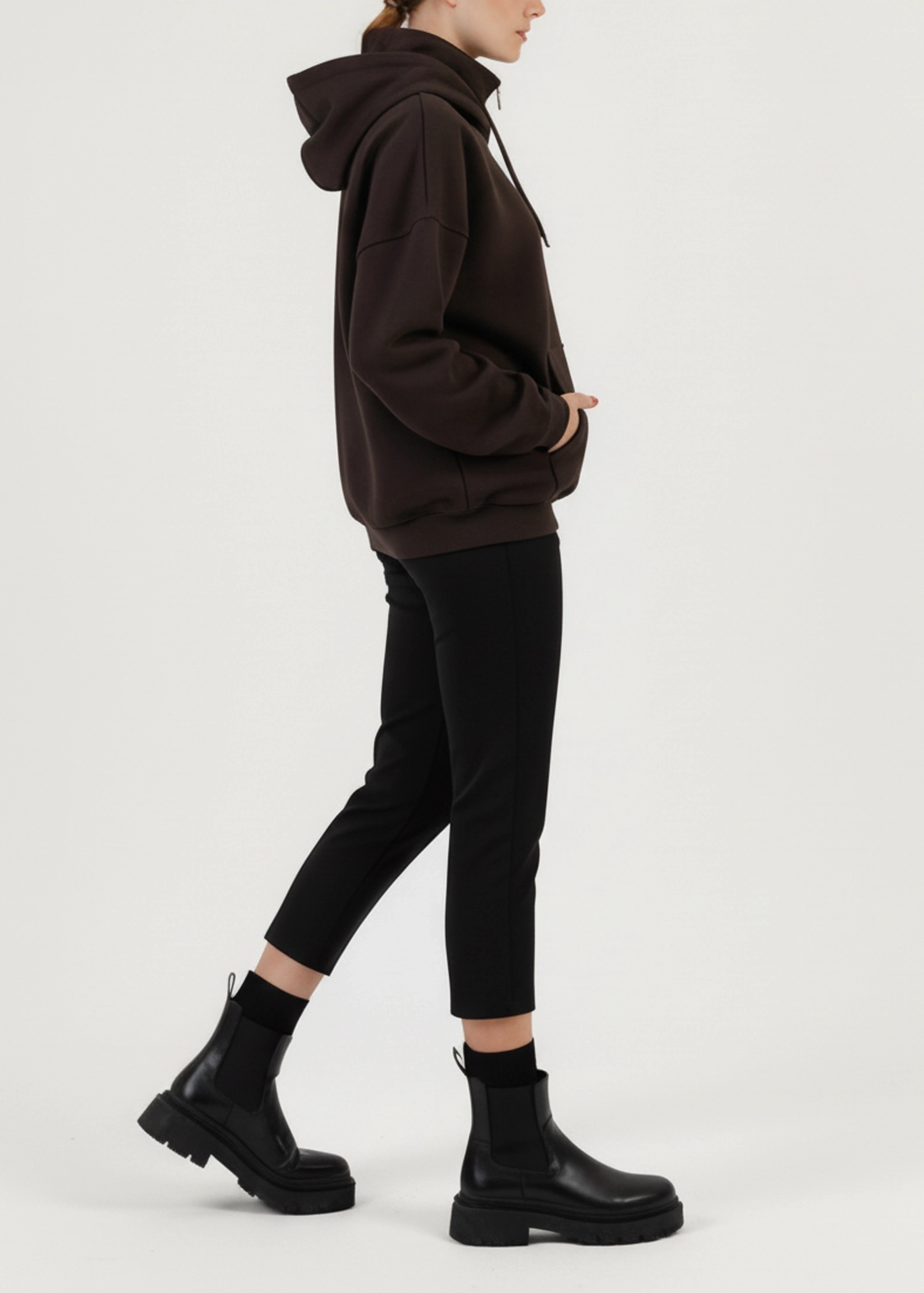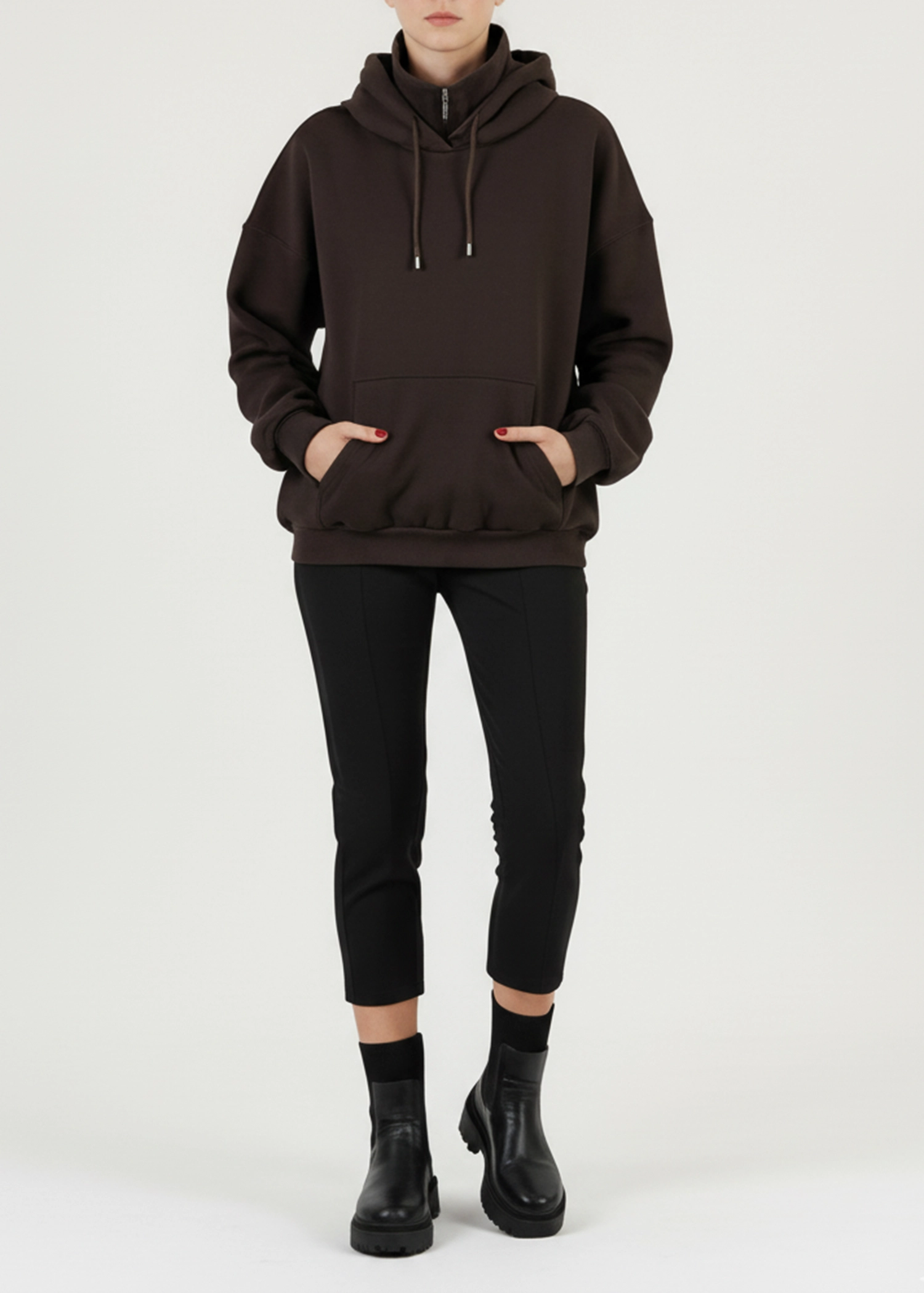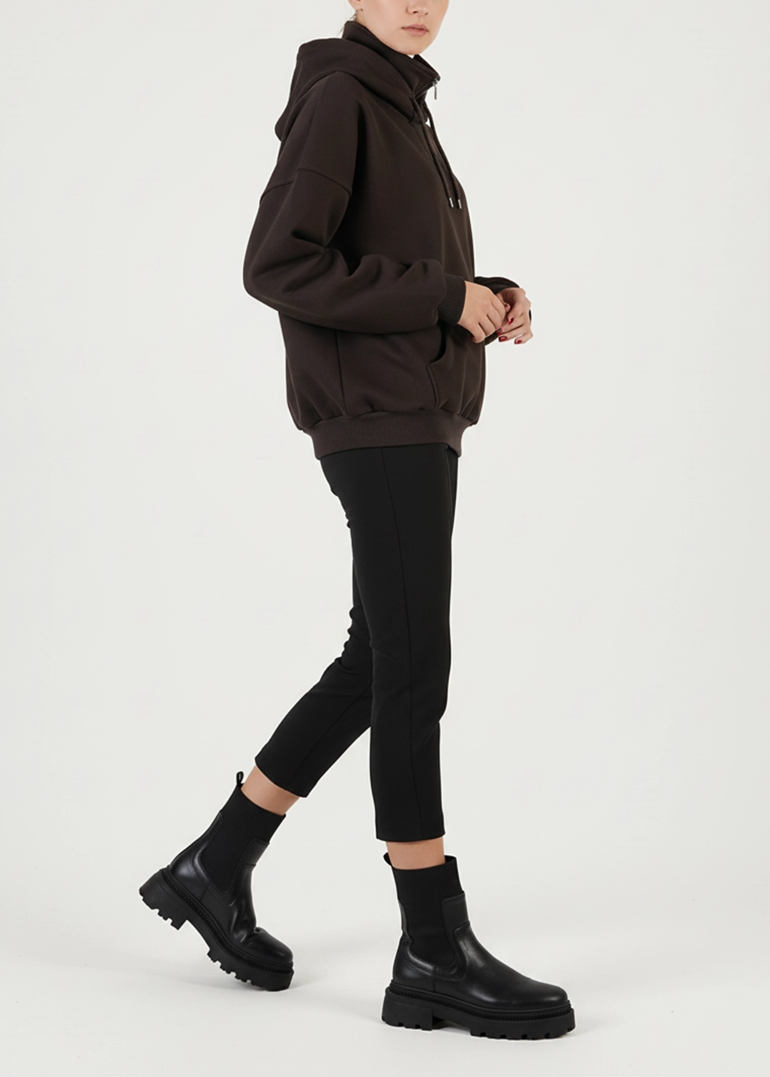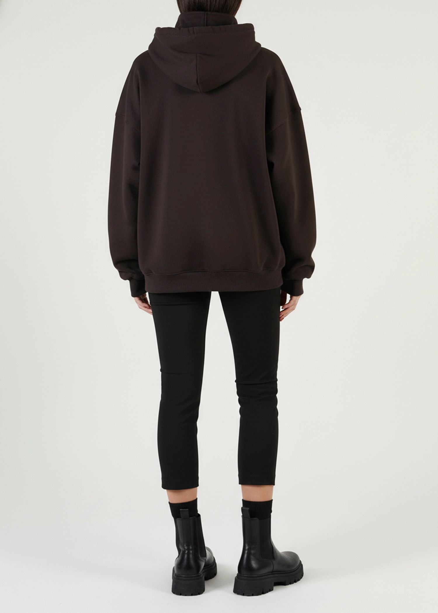 این هودی را می‌توانید همراه با شلوار اسلش، لگ مشکی، بوت اسپرت یا کتانی بپوشید. برای استایل خیابانی جذاب‌تر، می‌توانید آن را با بارانی یا کاپشن کوتاه لایه‌گذاری کنید.