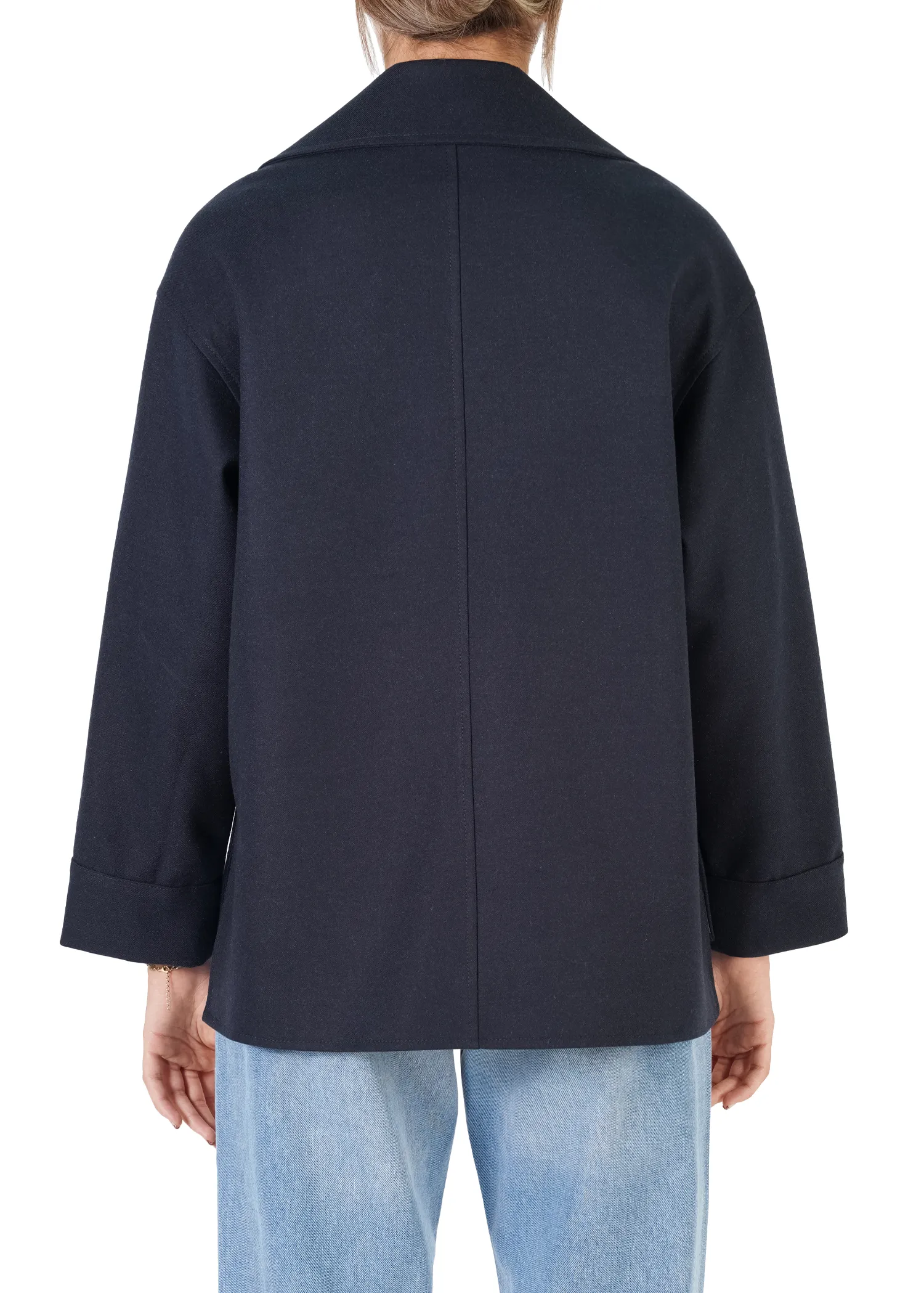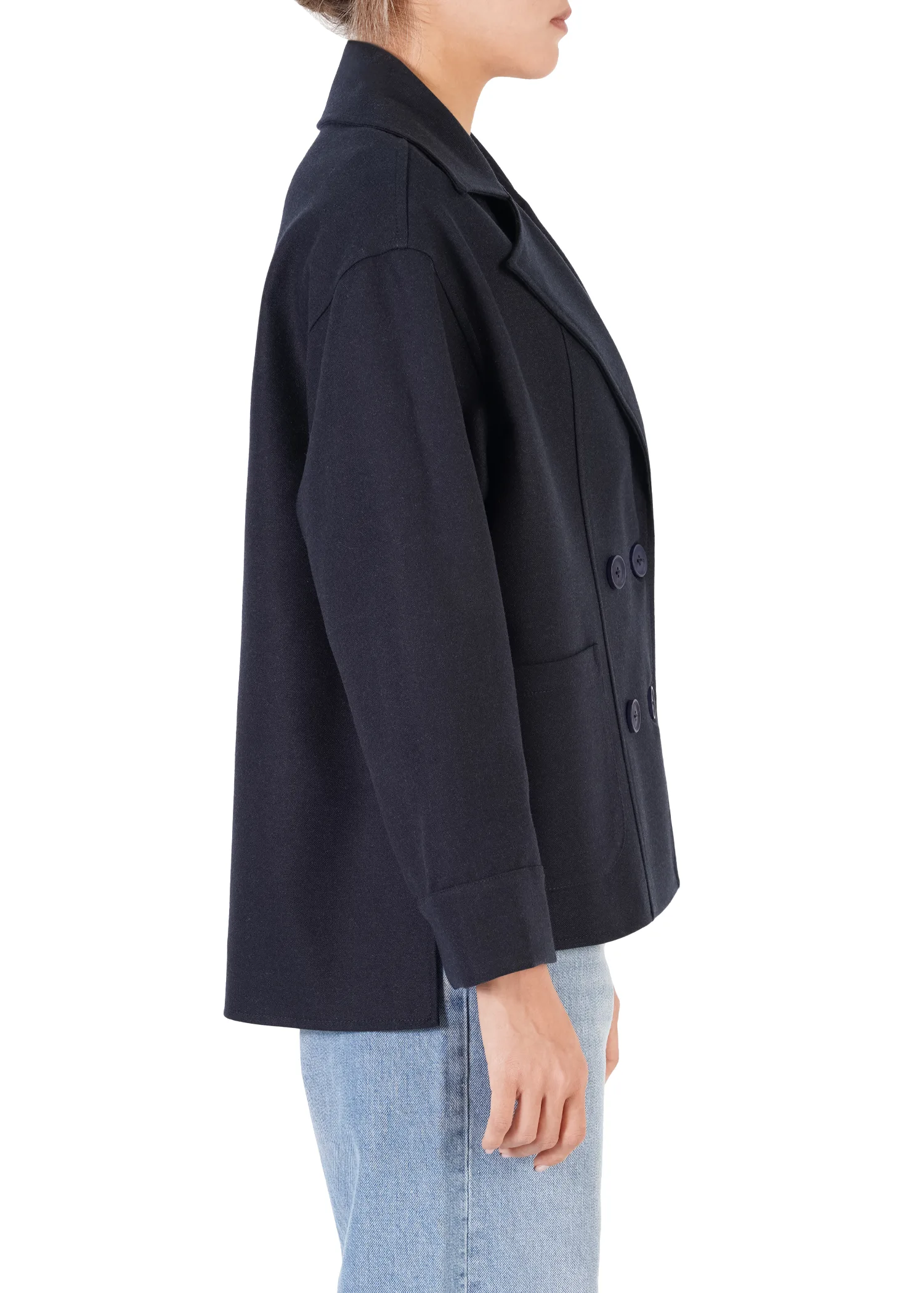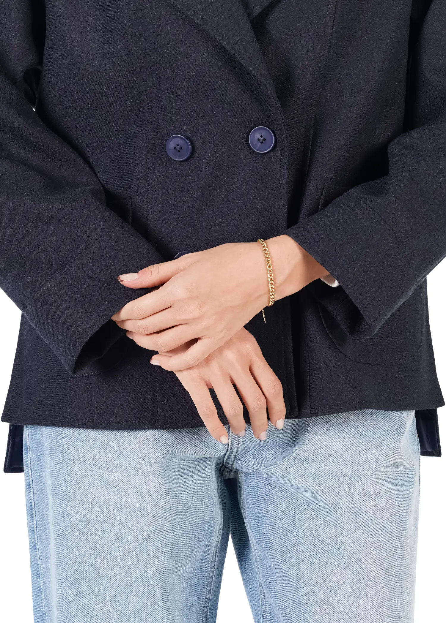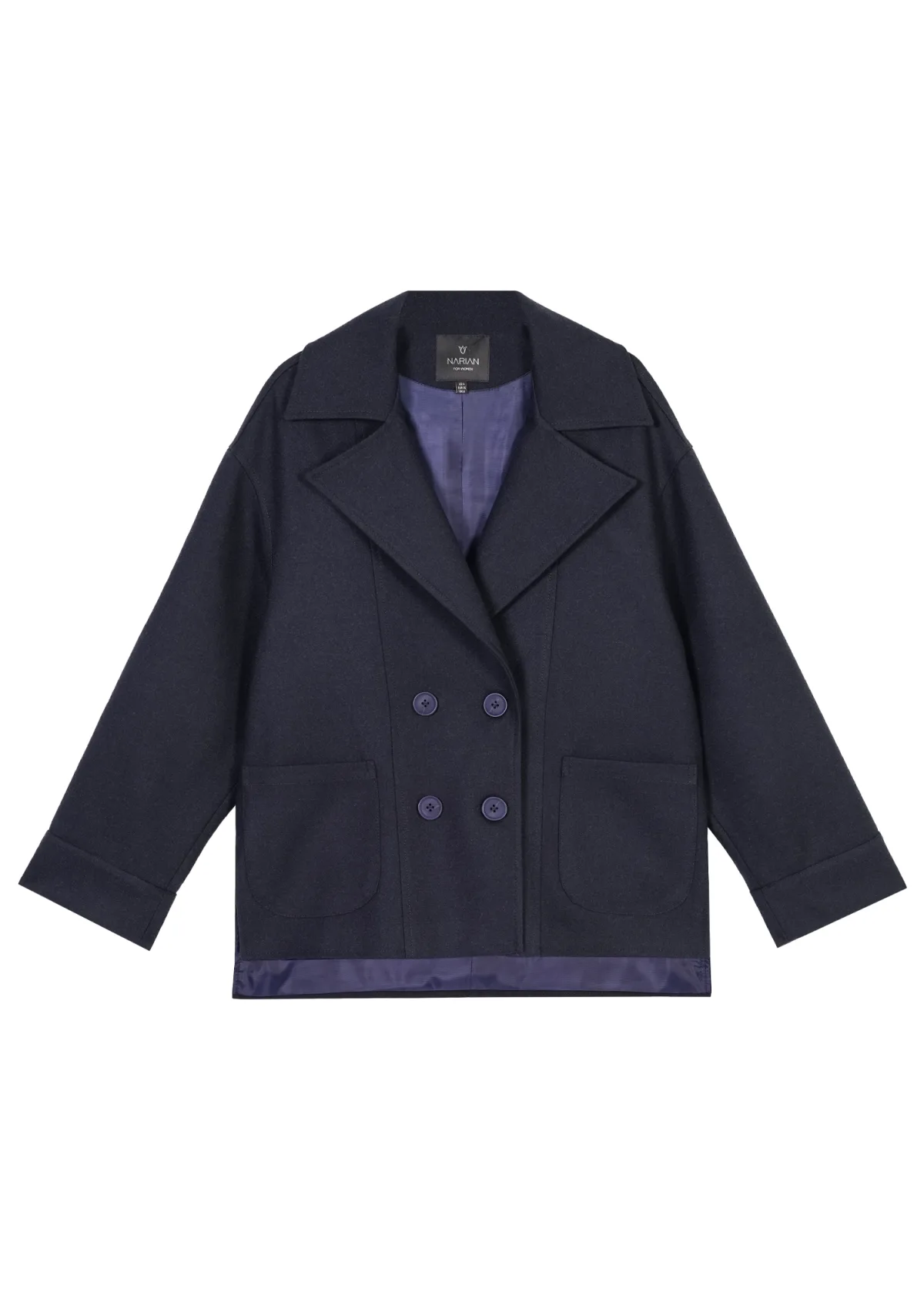 آستر داخلی این کت از جنس پونژه چاپی و همرنگ بدنه است که حس هماهنگی و کیفیت دوخت بالا را منتقل میکند. یقه پهن و دو ردیف دکمه در جلو، حس شیک و کلاسیک این مدل را کامل کردهاند.