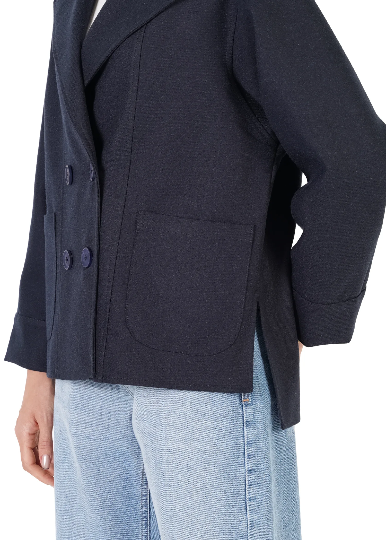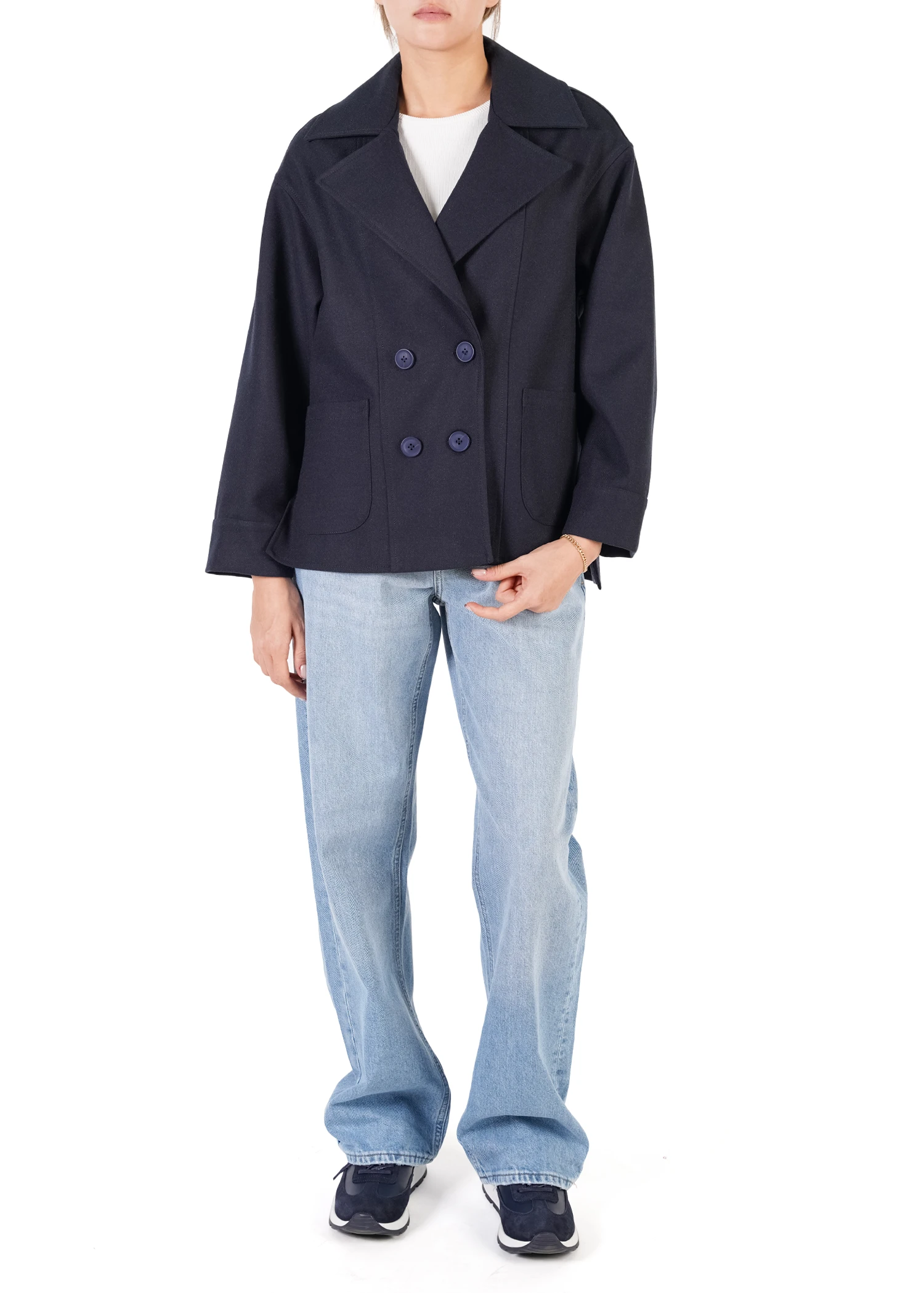 در قسمت جلو، دو جیب بزرگ با طراحی کاربردی و دوخت تمیز قرار گرفتهاند که ضمن حفظ سادگی، جلوهای ساختاریافته به لباس میدهند. پشت کت نسبت به جلو ۵ سانتیمتر بلندتر طراحی شده تا ضمن ایجاد توازن در استایل، فرم بدن را کشیدهتر نشان دهد.